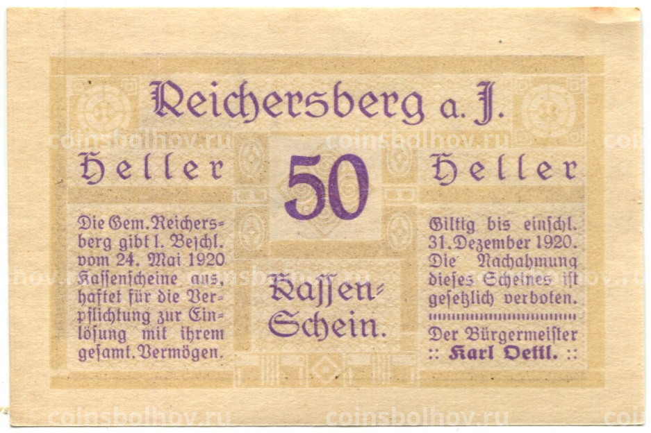 50 геллеров 1920 года Австрия — Рейхенберг (нотгельд)