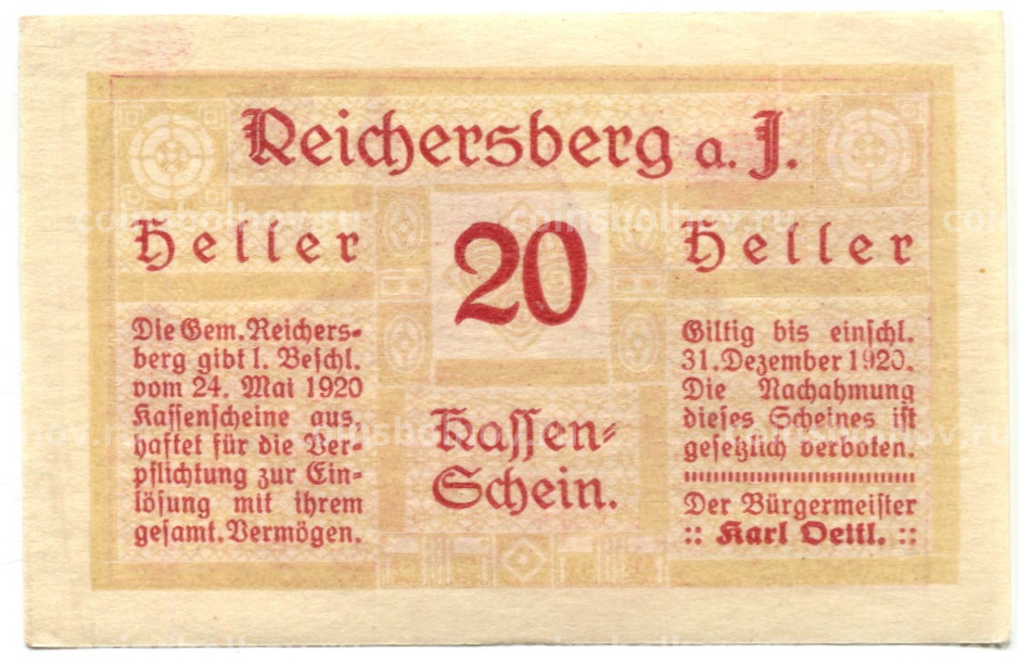 20 геллеров 1920 года Австрия — Рейхенберг (нотгельд)