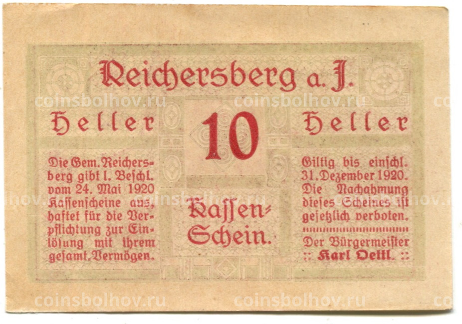 10 геллеров 1920 года Австрия — Рейхенберг (нотгельд)