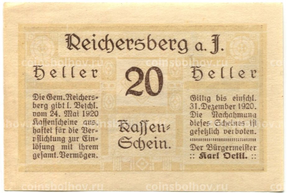 20 геллеров 1920 года Австрия — Рейхенберг (нотгельд)