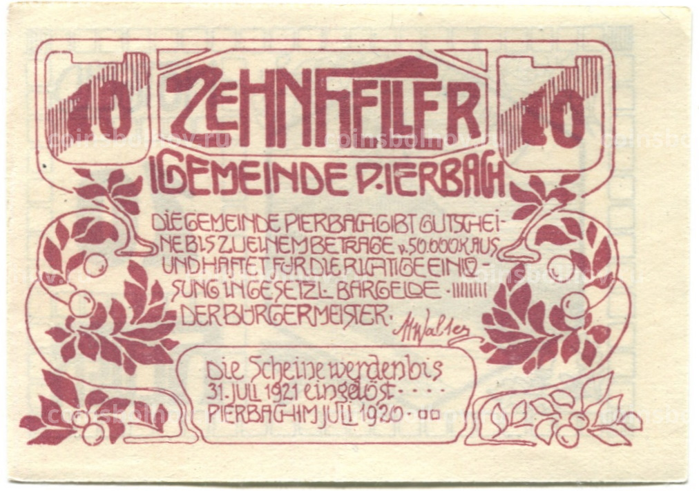 10 геллеров 1920 года Австрия — Пирбах (нотгельд)
