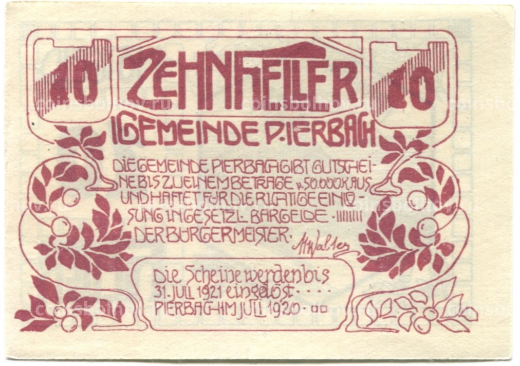 Банкнота 10 геллеров 1920 года Австрия — Пирбах (нотгельд)