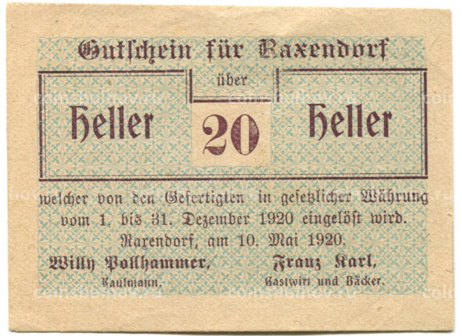 Банкнота 20 геллеров 1920 года Австрия — Раксендорф (нотгельд)