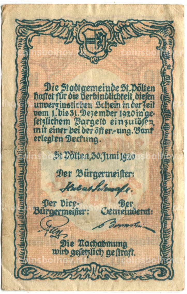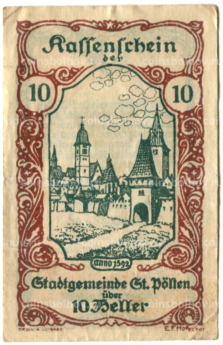 Банкнота 10 геллеров 1920 года Австрия — Сен-Пёлтен (нотгельд)
