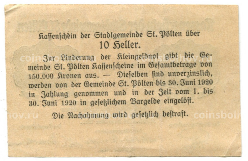 Банкнота 10 геллеров 1919 года Австрия — Сен-Пёлтен (нотгельд)