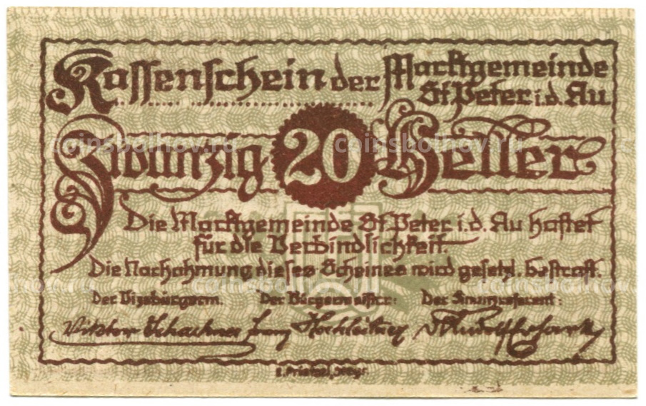 Банкнота 20 геллеров 1920 года Австрия — Санкт-Петер-ин-дер-Ау (нотгельд)