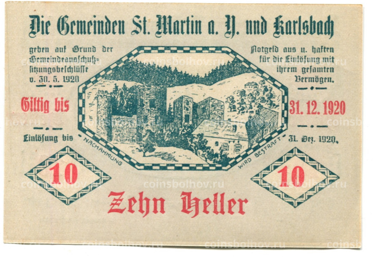 Банкнота 10 геллеров 1920 года Австрия — Санкт-Мартин-Карлсбах (нотгельд)