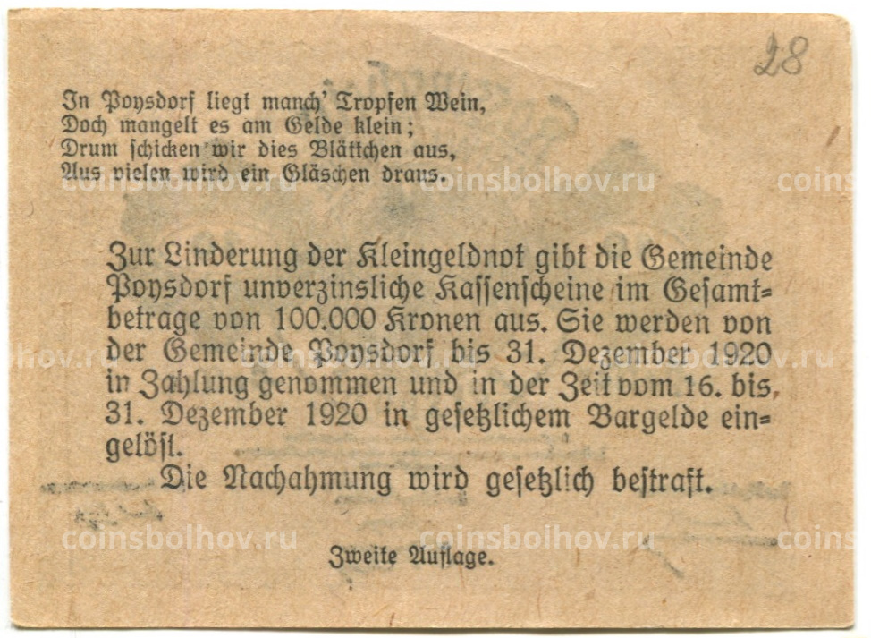 Банкнота 10 геллеров 1920 года Австрия — Пойсдорф (нотгельд)