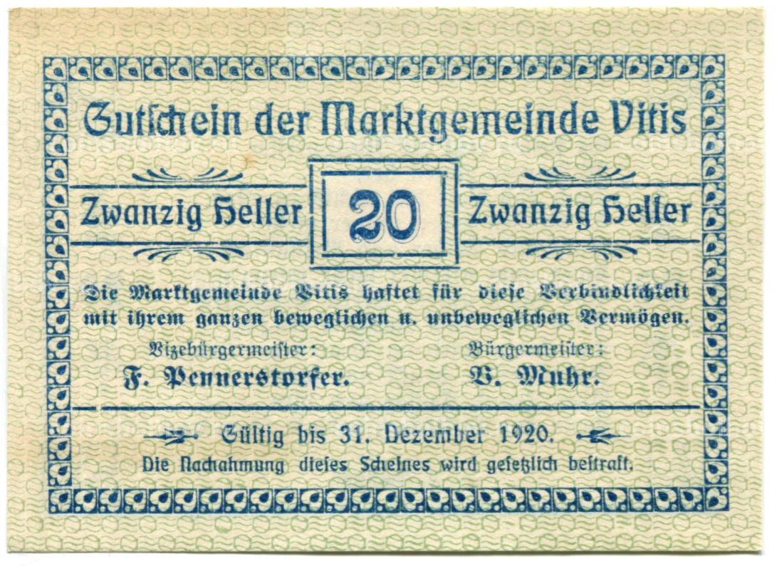 20 геллеров 1920 года Австрия — Витис (нотгельд)