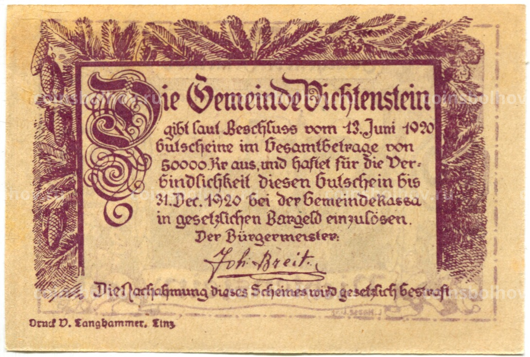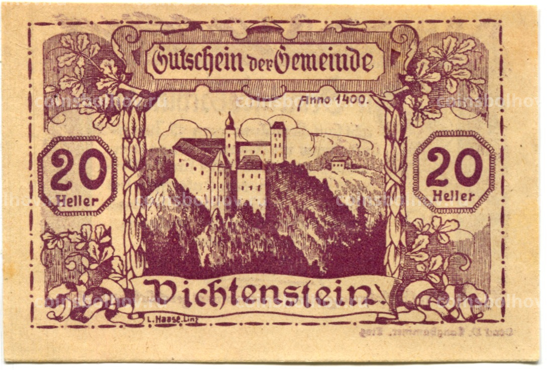 20 геллеров 1920 года Австрия — Вихтенштайн (нотгельд)
