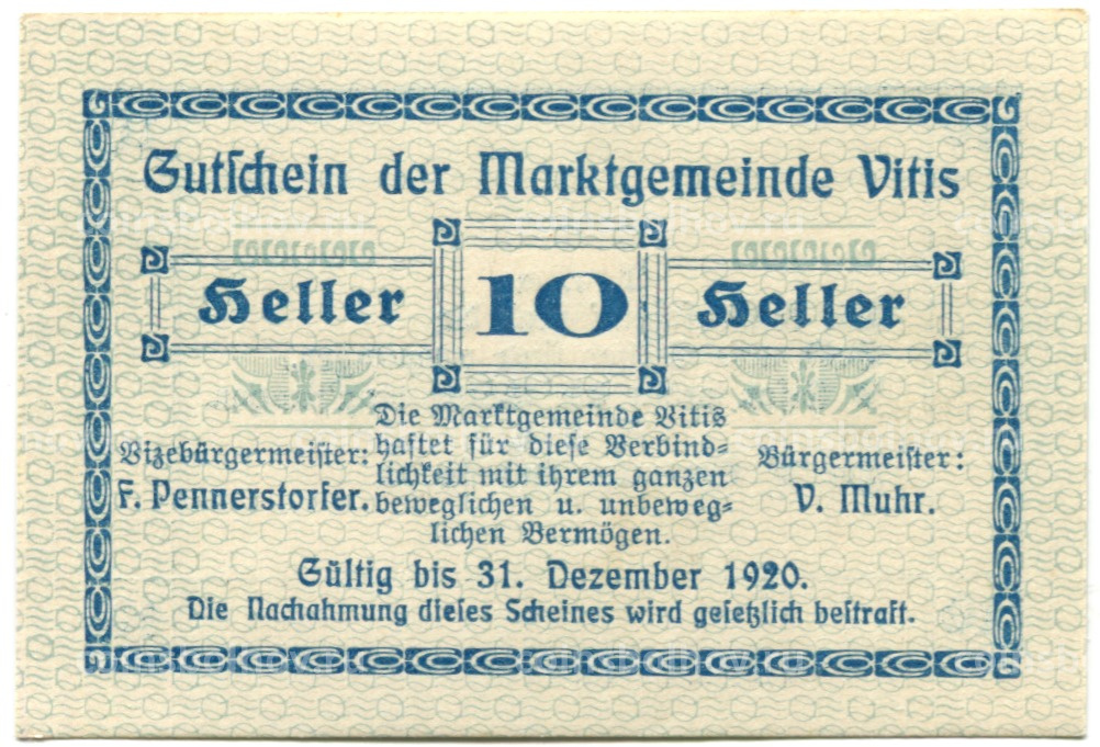 10 геллеров 1920 года Австрия — Витис (нотгельд)
