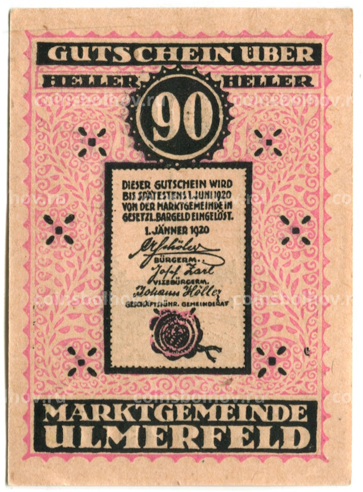 90 геллеров 1920 года Австрия — Ульмерфельд (нотгельд)