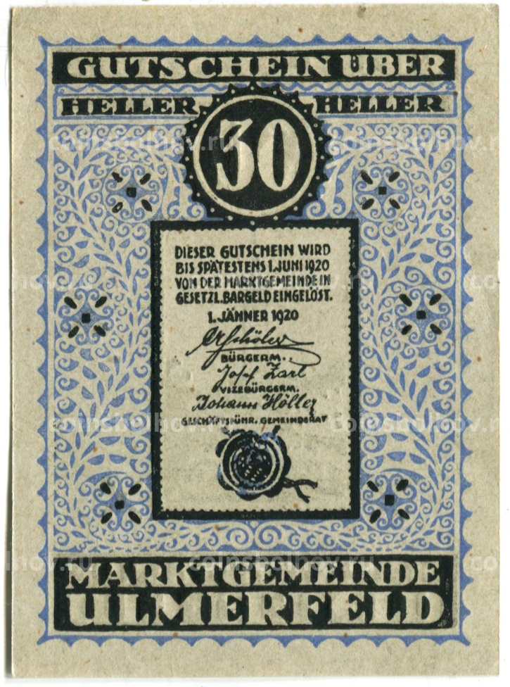 30 геллеров 1920 года Австрия — Ульмерфельд (нотгельд)