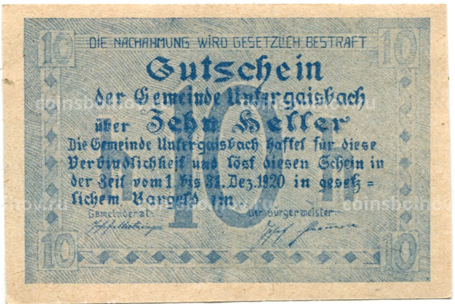 10 геллеров 1920 года Австрия — Унтерайсбах (нотгельд)