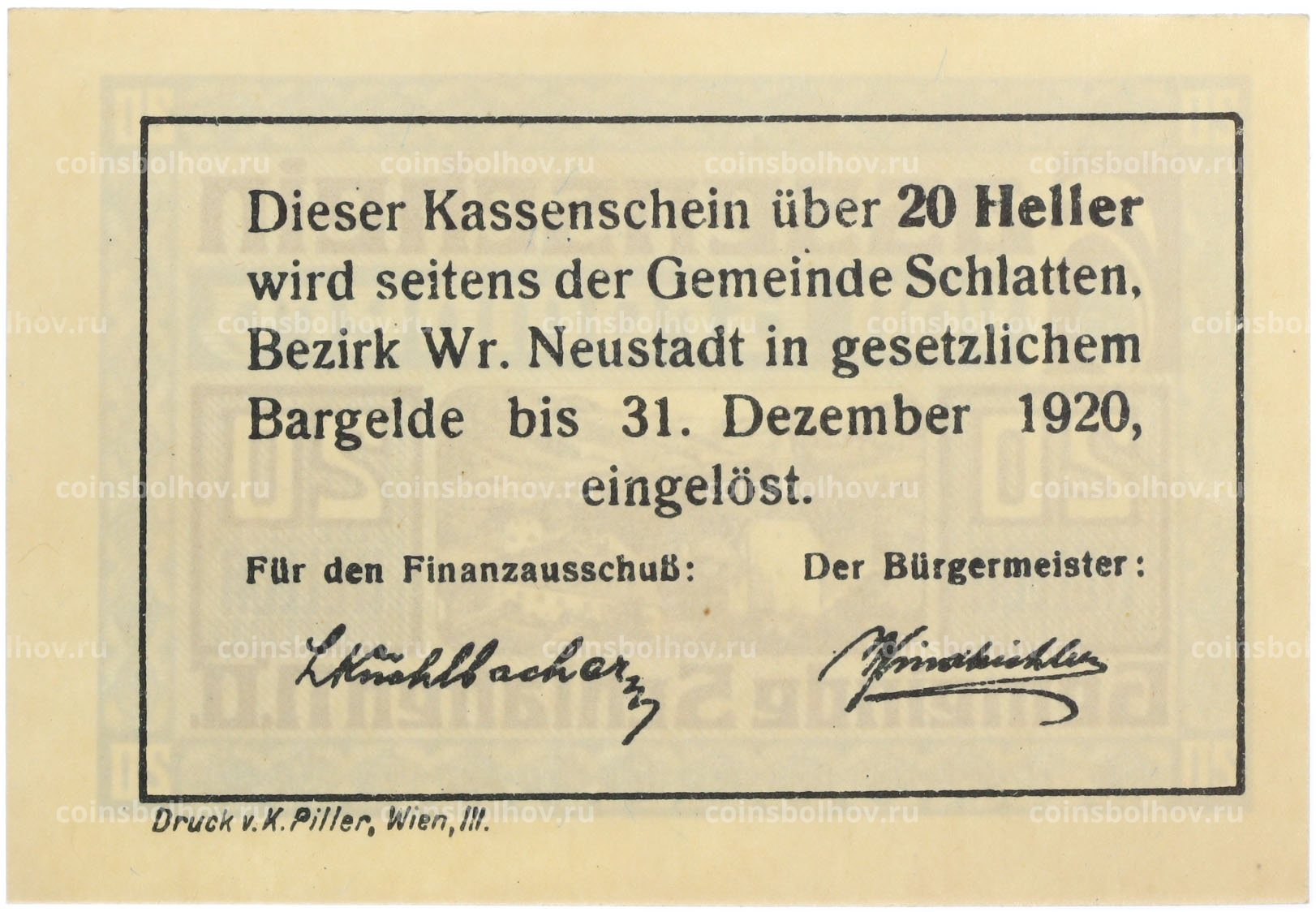 Банкнота 20 геллеров 1920 года Австрия — город Шлаттен (Нотгельд)