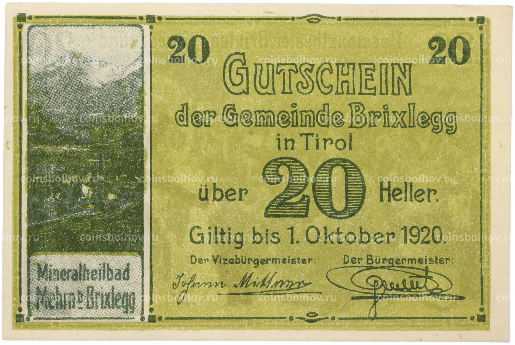 Банкнота 20 геллеров 1920 года Австрия — община Брикслегг в Тироле (Нотгельд)