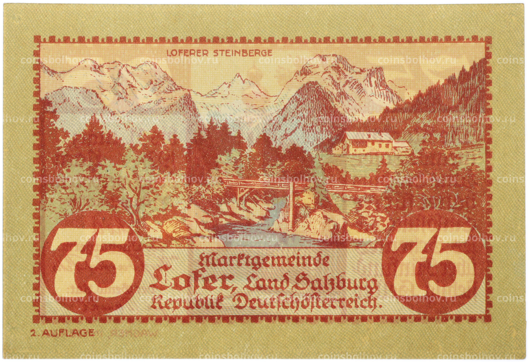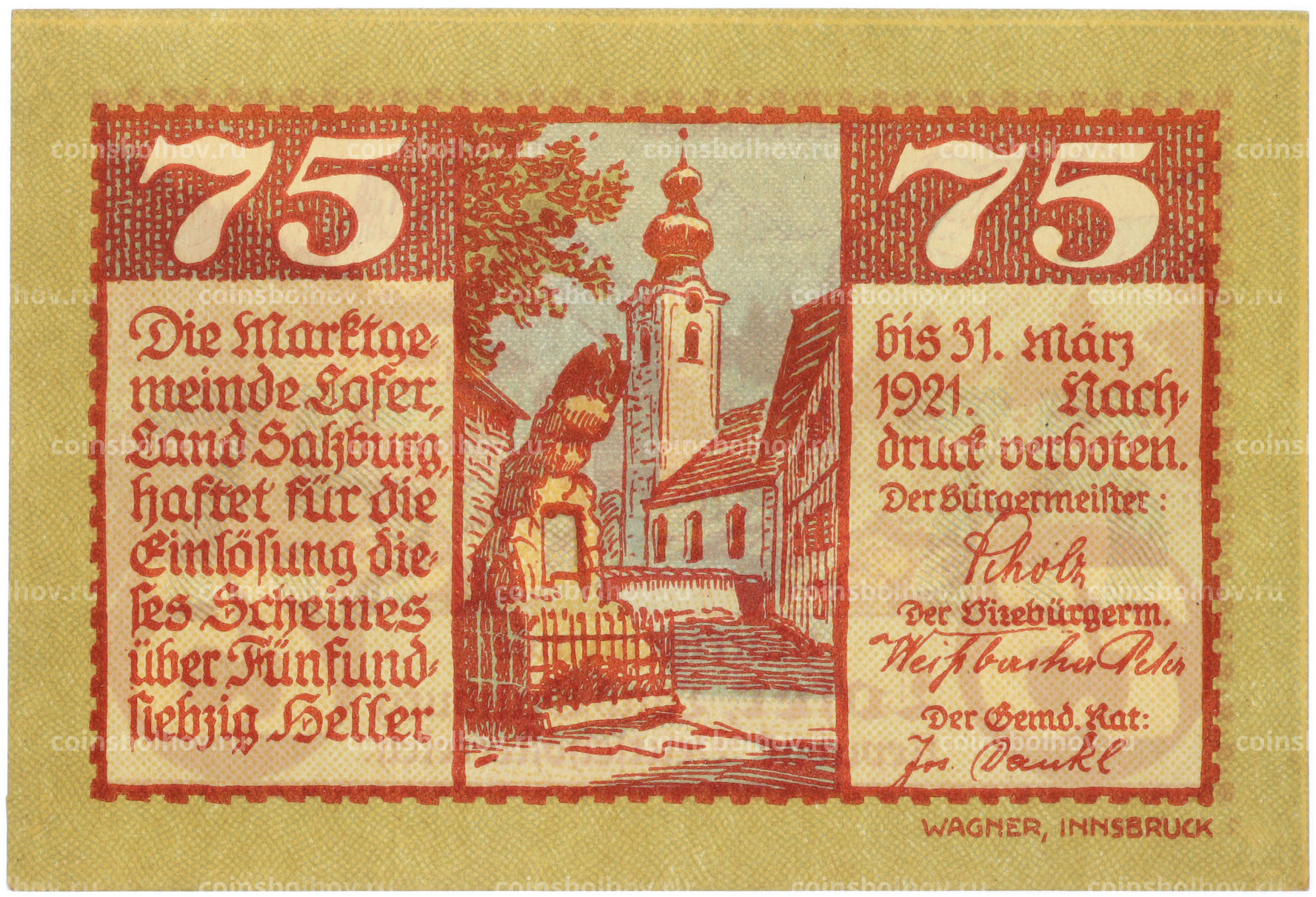Банкнота 75 геллеров 1921 года Австрия — община Лофер в Зальцбурге (Нотгельд)