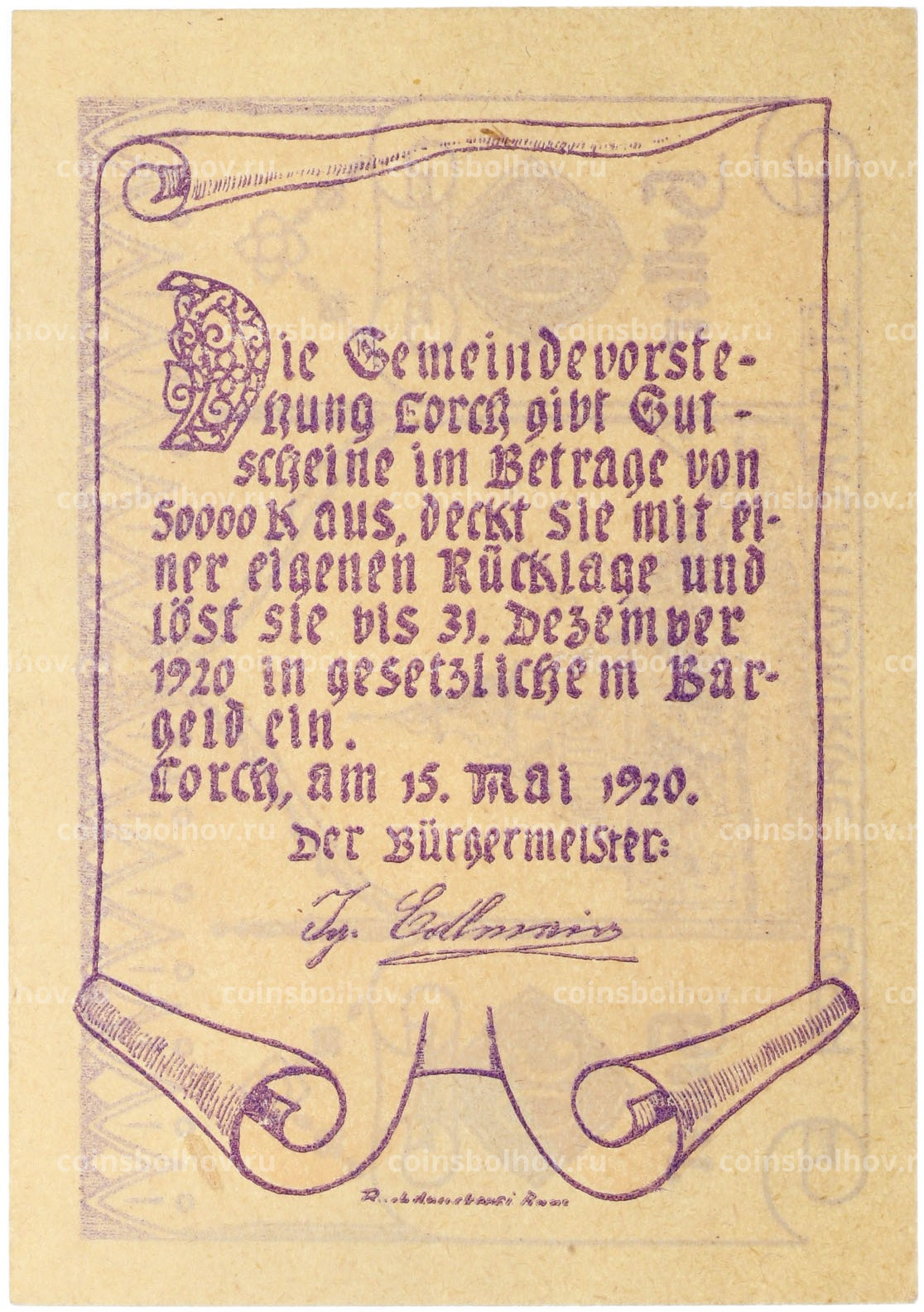 Банкнота 50 геллеров 1920 года Австрия — коммуна Лорх (Нотгельд)