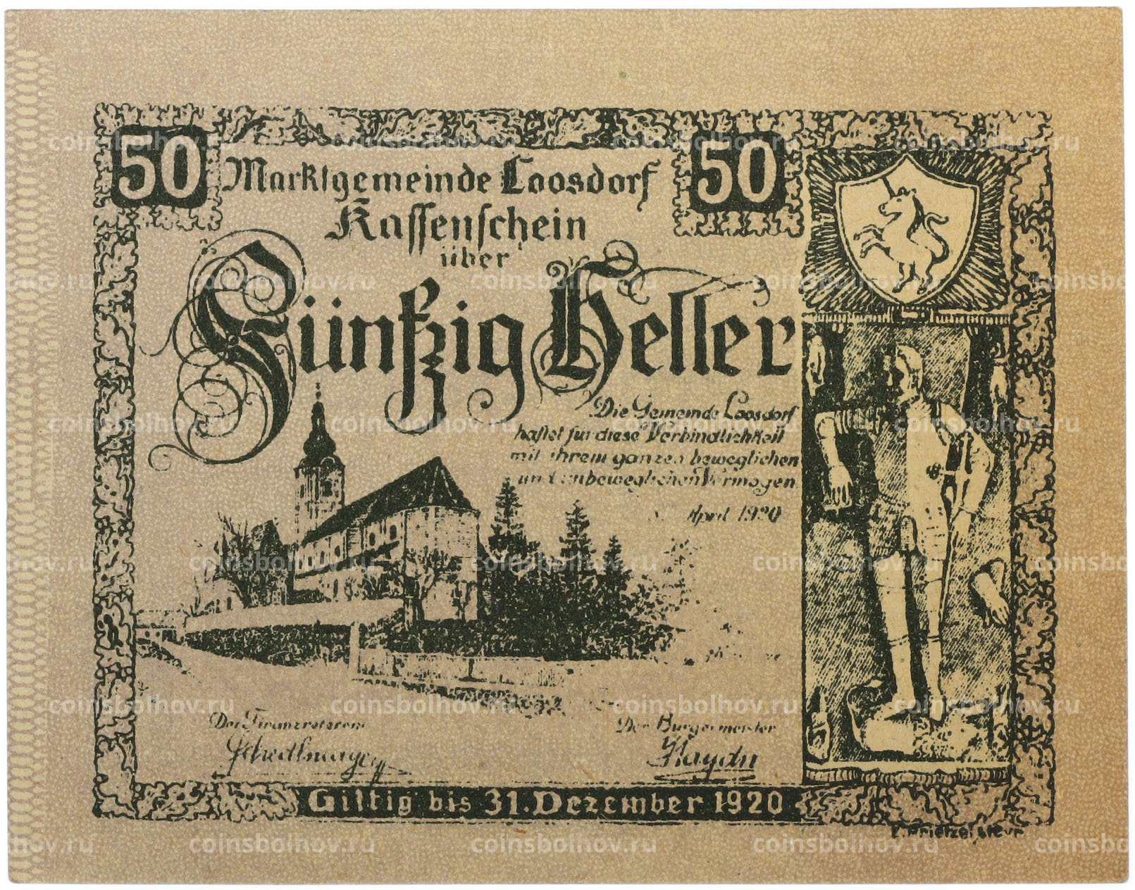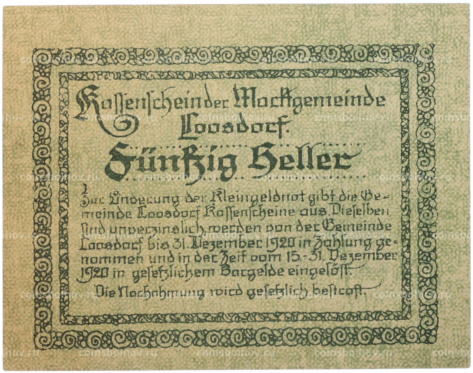Банкнота 50 геллеров 1920 года Австрия — община Лоосдорф (Нотгельд)