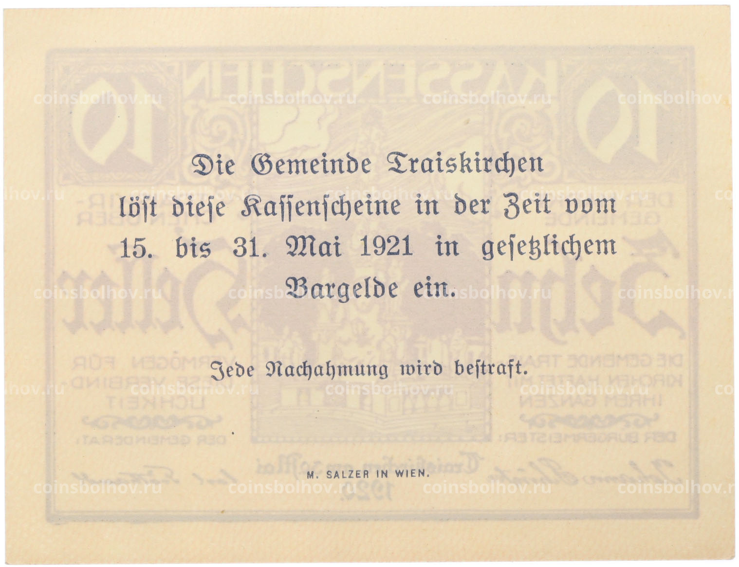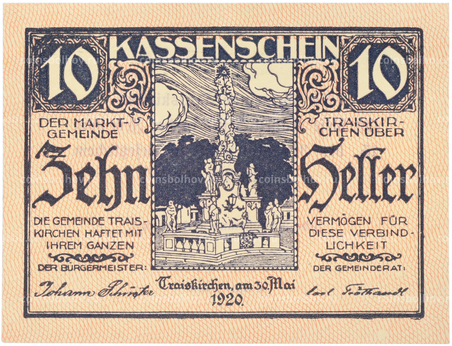Банкнота 10 геллеров 1920 года Австрия — город Трайскирхен (Нотгельд)