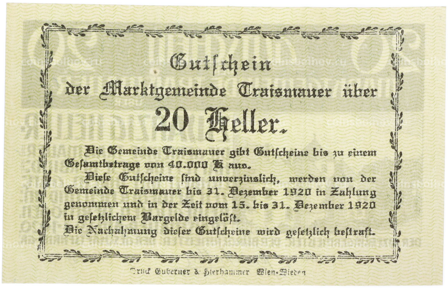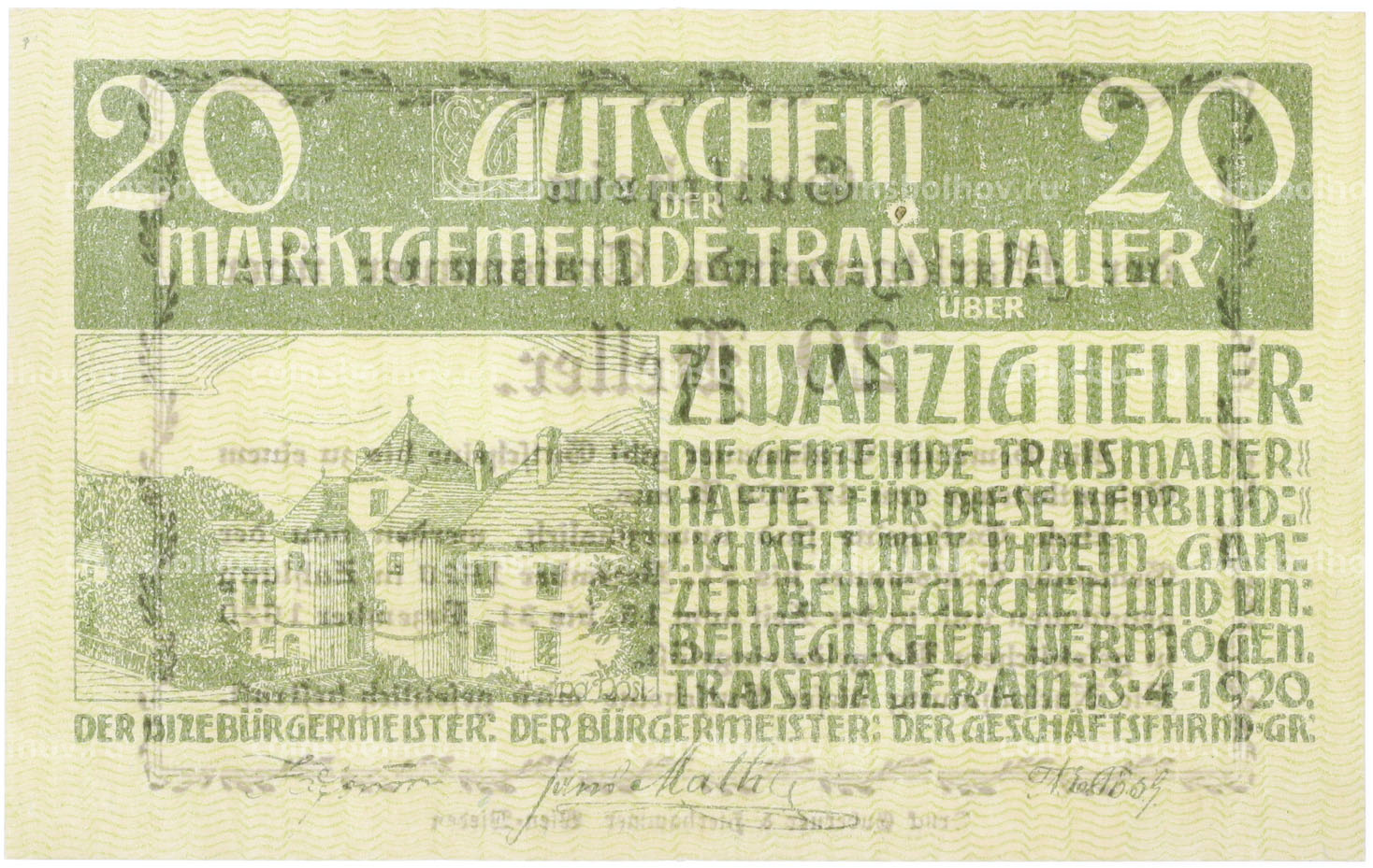 Банкнота 20 геллеров 1920 года Австрия — город Трайсмауэр (Нотгельд)