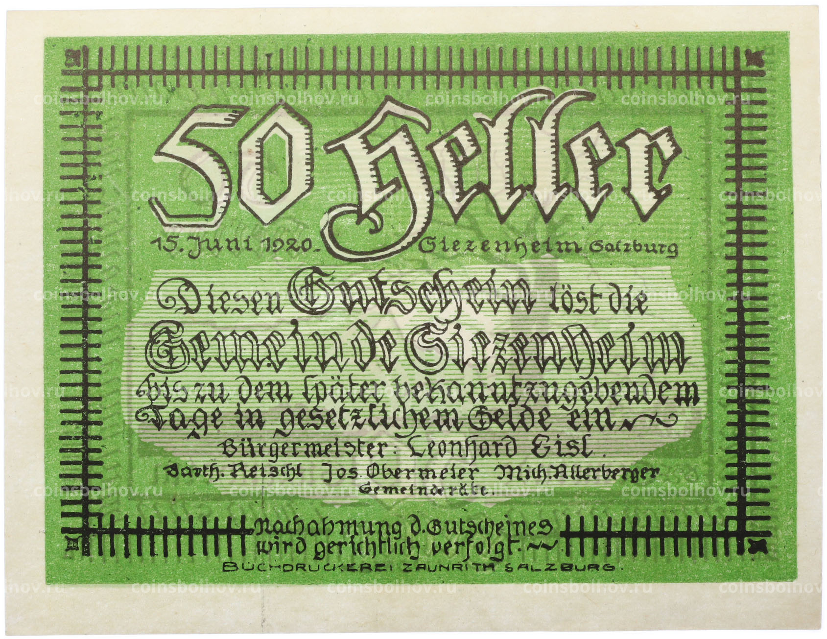 Банкнота 50 геллеров 1920 года Австрия — община Зиценхайм (Нотгельд)