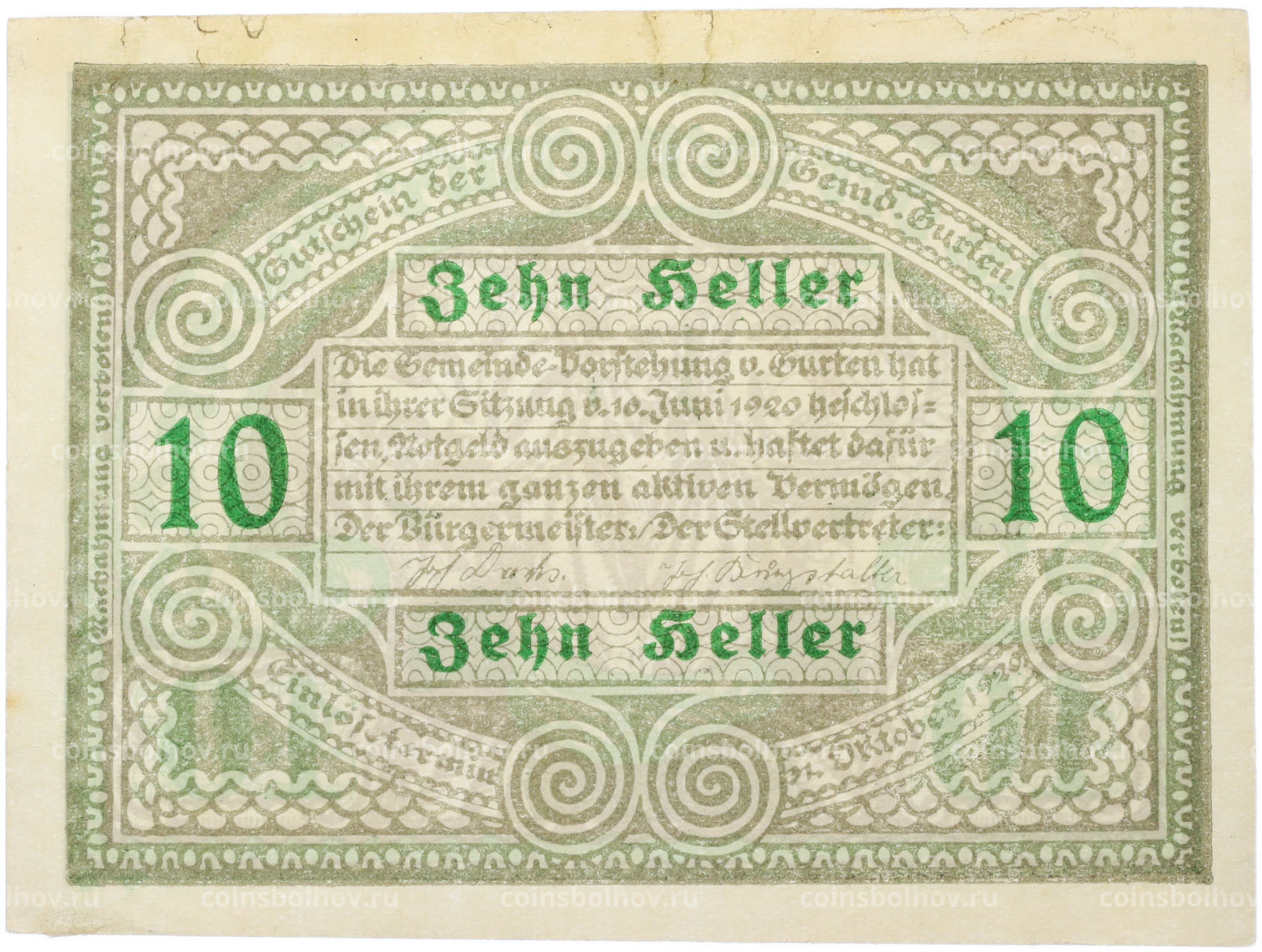 Банкнота 10 геллеров 1920 года Австрия — община Гуртен (Нотгельд)