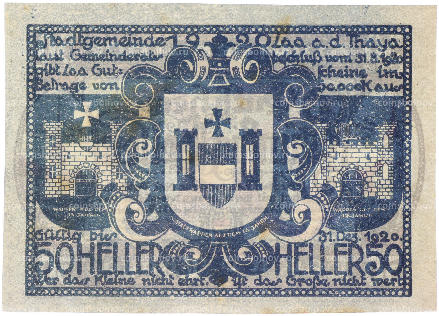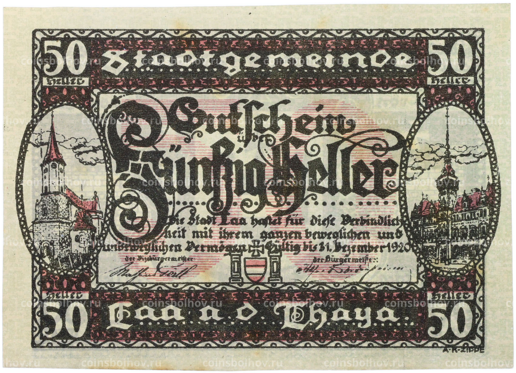 Банкнота 50 геллеров 1920 года Австрия — город Лаа-ан-дер-Тайя (Нотгельд)