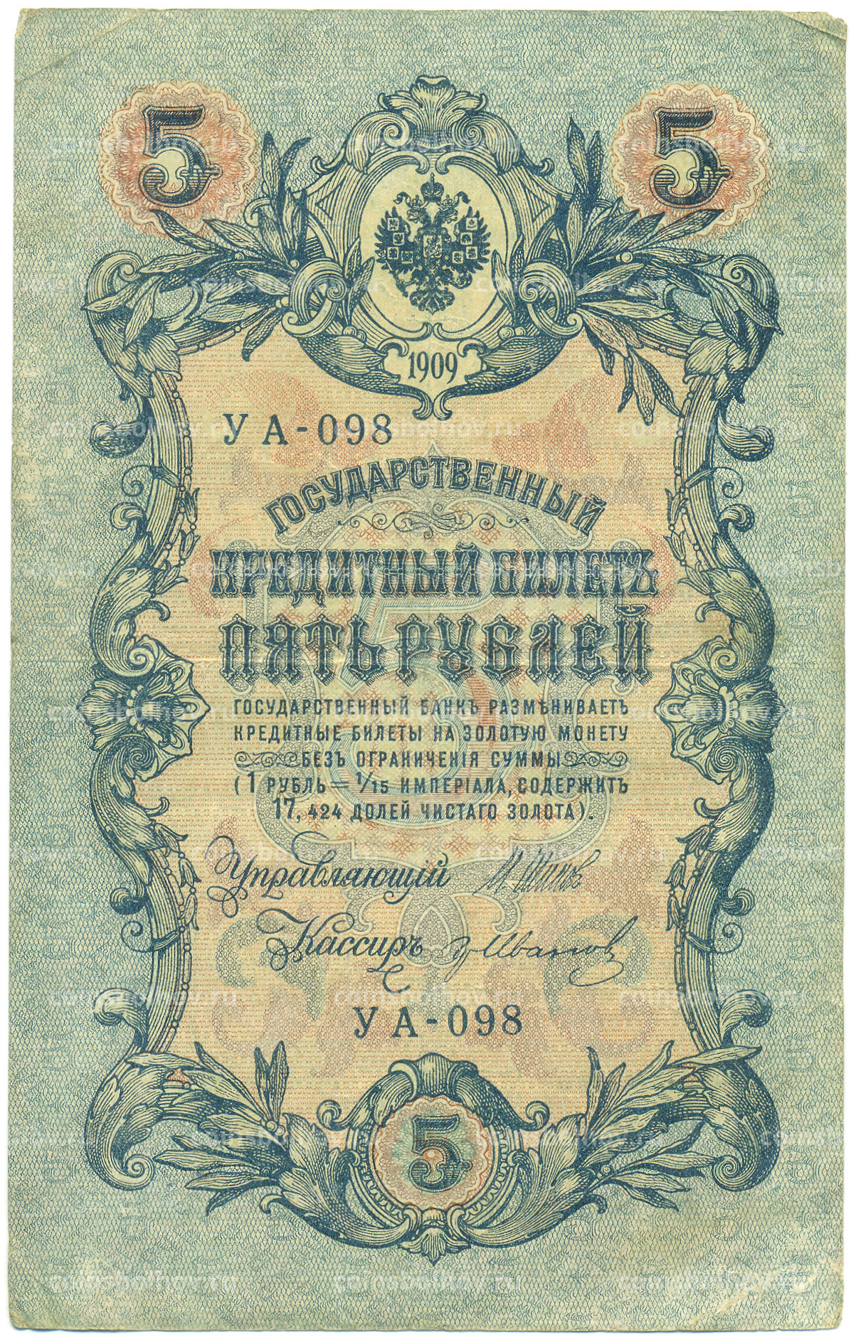 Банкнота 5 рублей 1909 года Шипов / Иванов