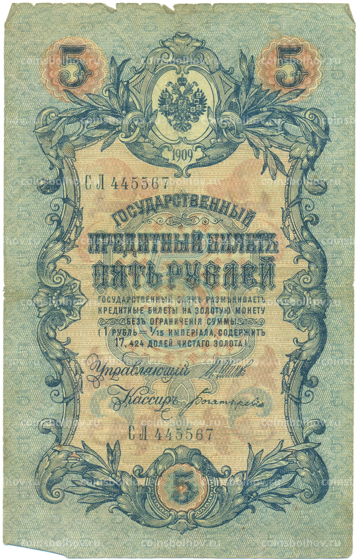 Банкнота 5 рублей 1909 года Шипов / Богатырев