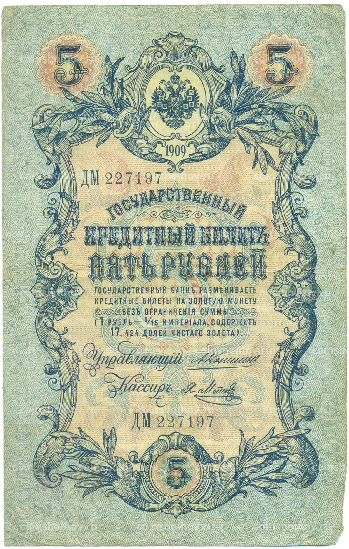 Банкнота 5 рублей 1909 года Коншин / Метц