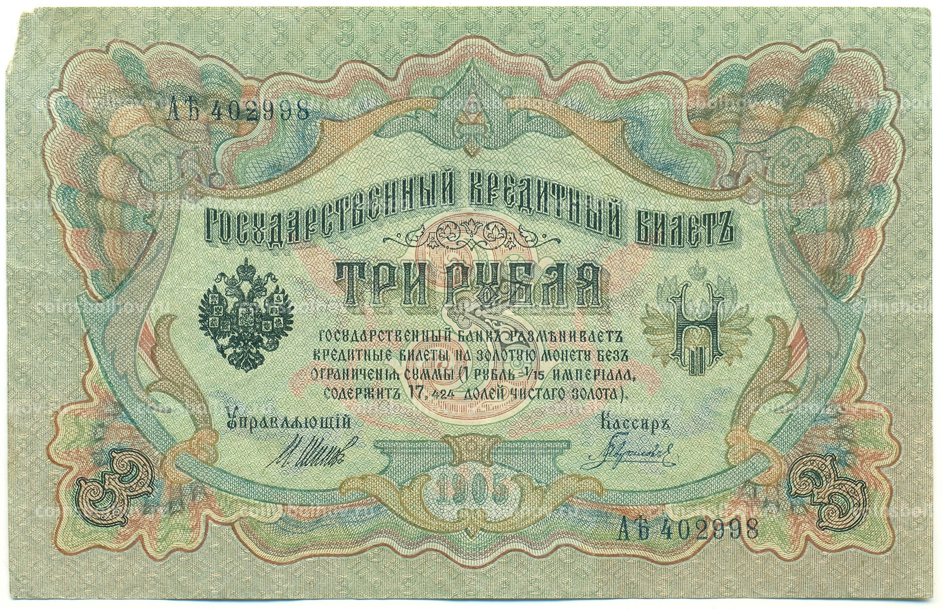 Банкнота 3 рубля 1905 года Шипов / Гаврилов