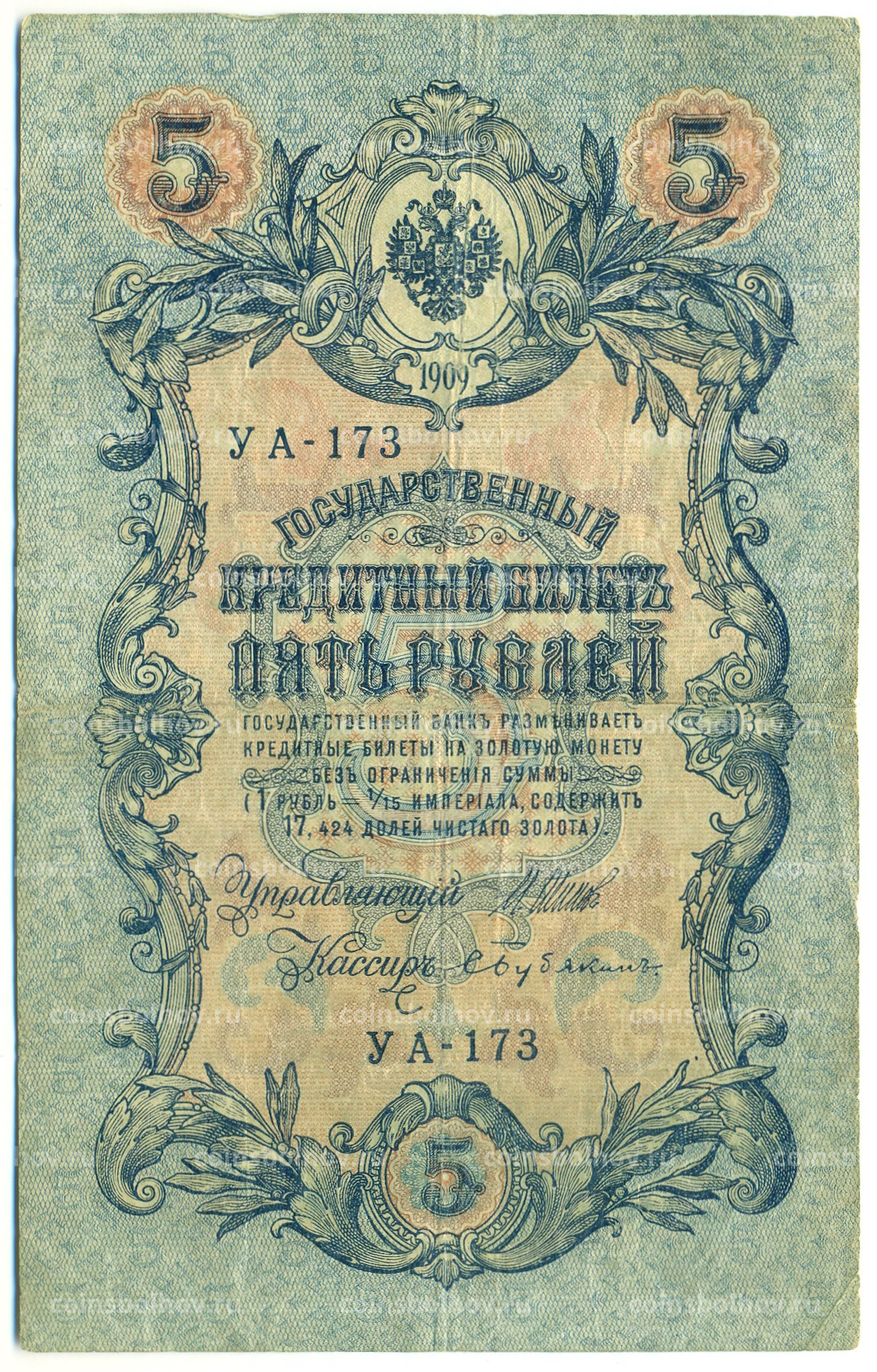 Банкнота 5 рублей 1909 года Шипов / Бубякин