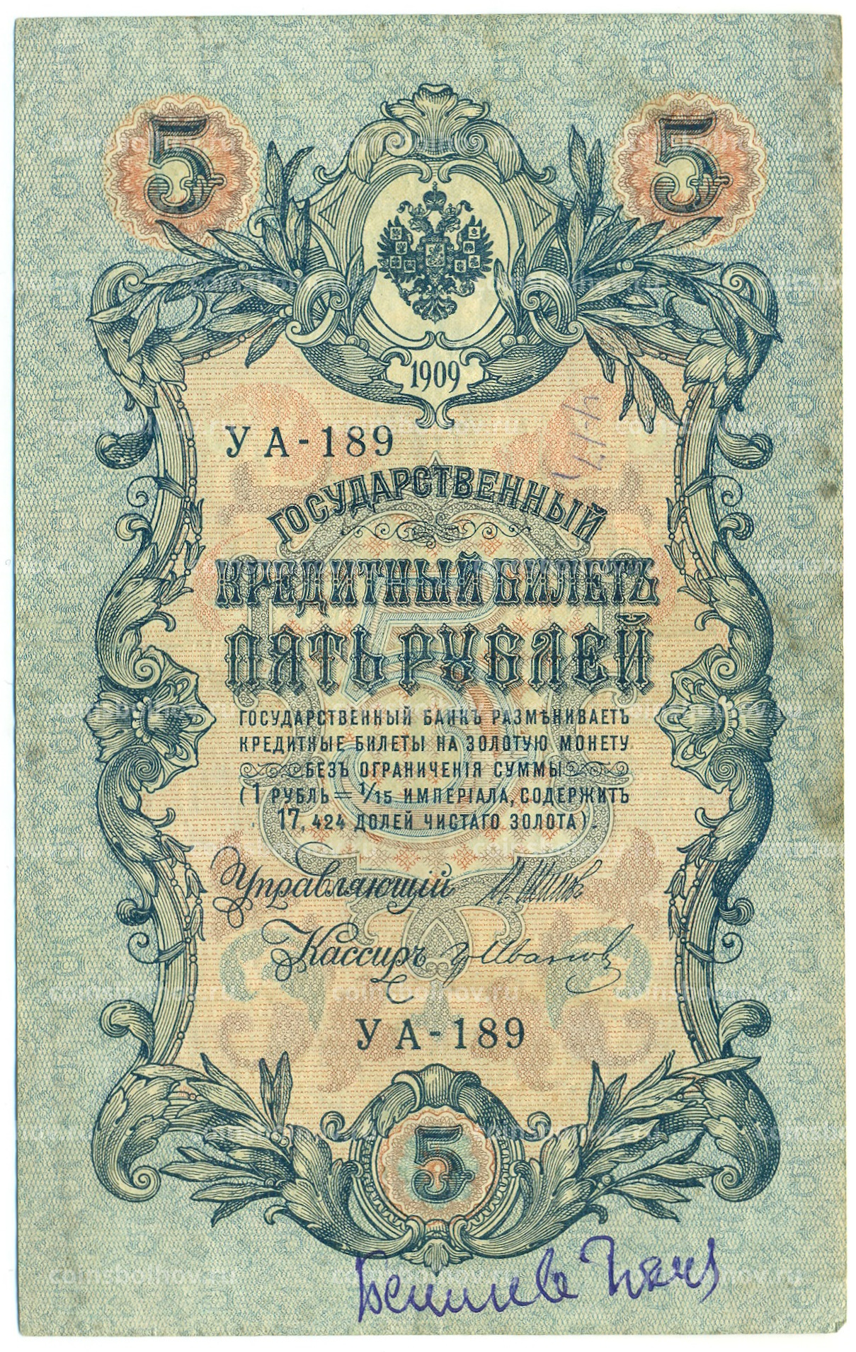 Банкнота 5 рублей 1909 года Шипов / Иванов