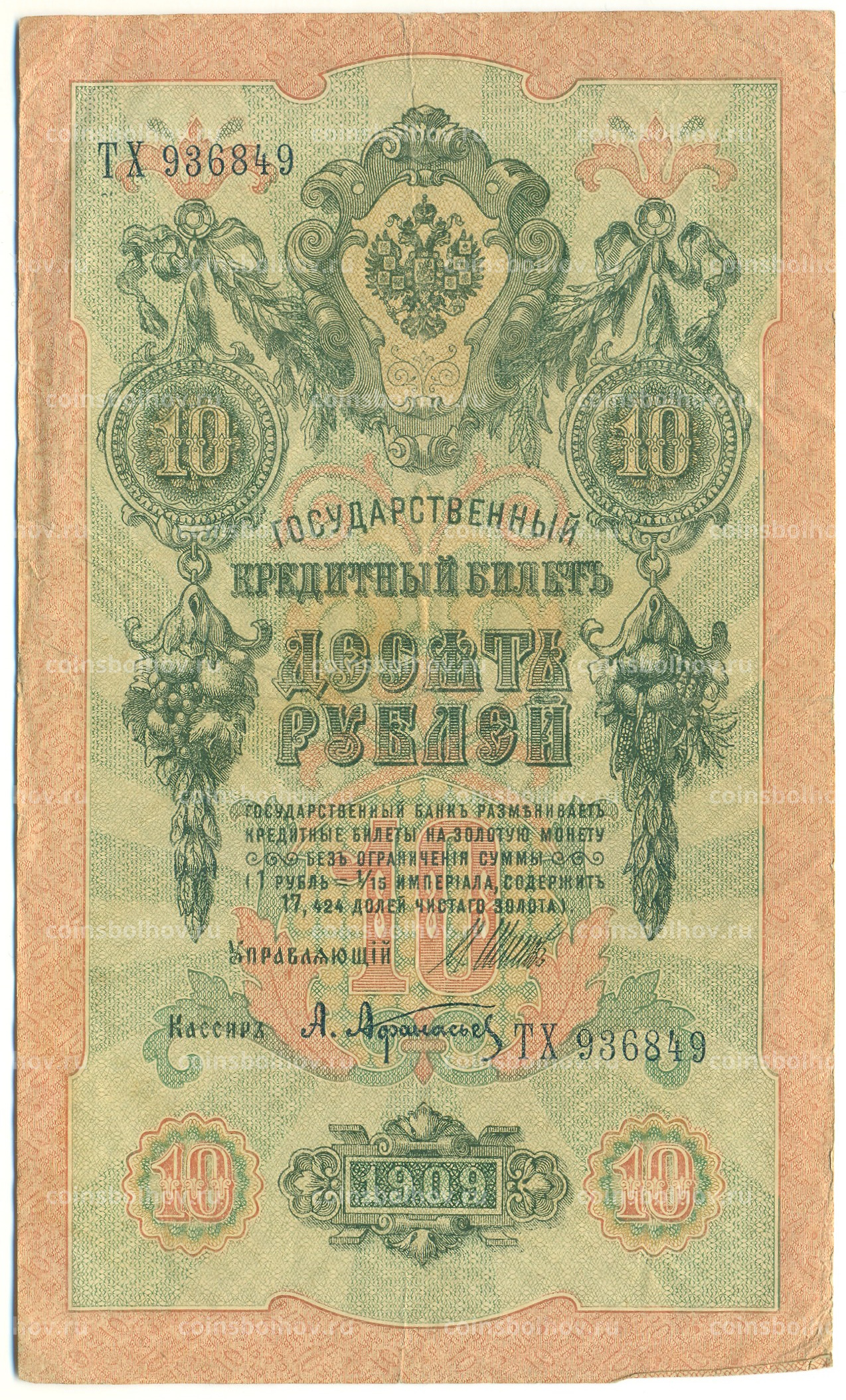 Банкнота 10 рублей 1909 года Шипов / Афанасьев