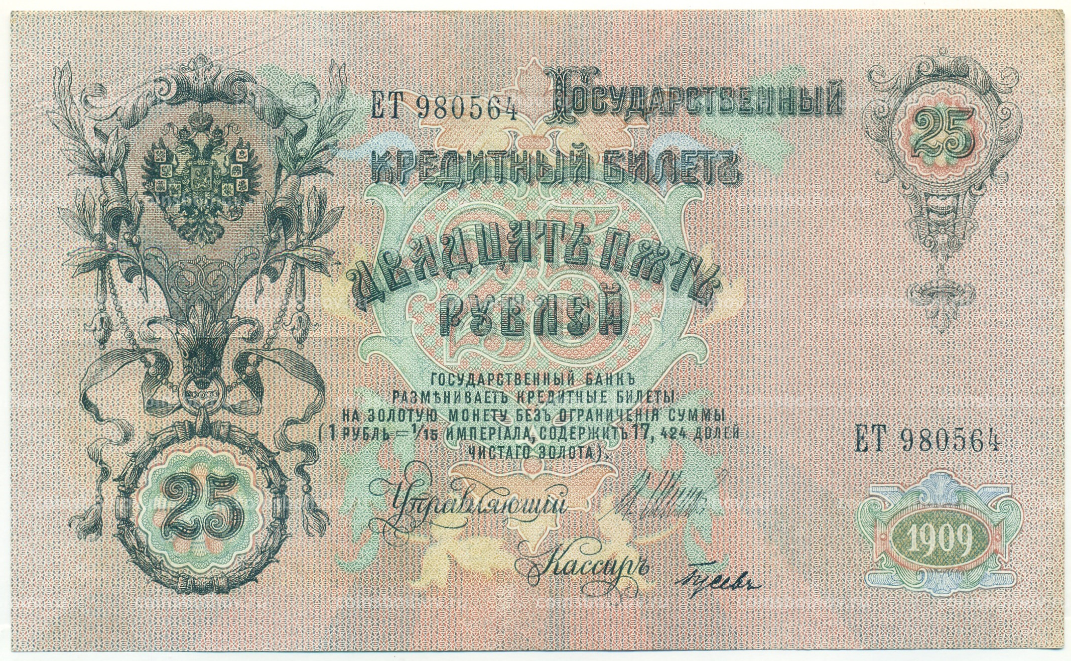 Банкнота 25 рублей 1909 года Шипов / Гусев