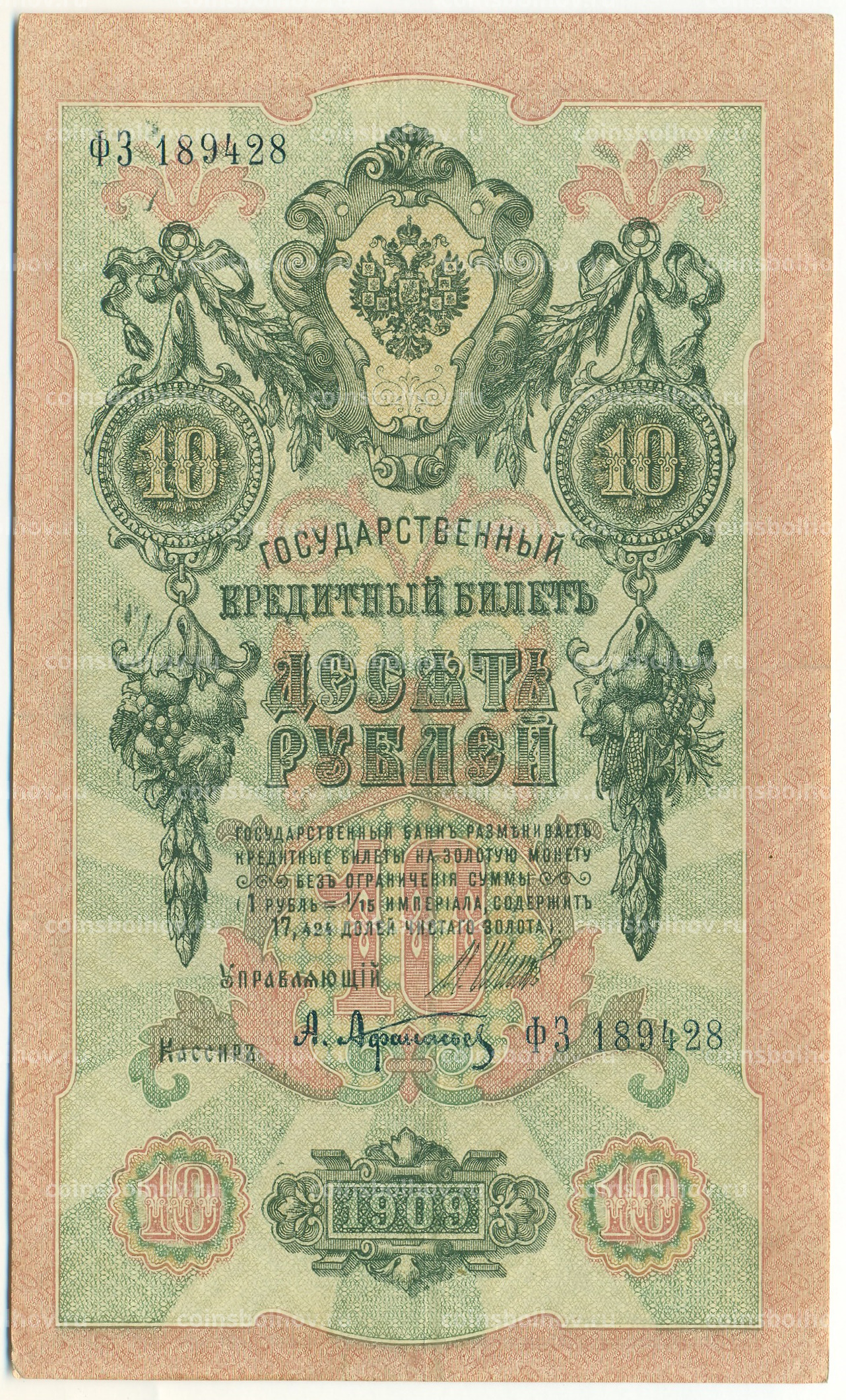 Банкнота 10 рублей 1909 года Шипов / Афанасьев