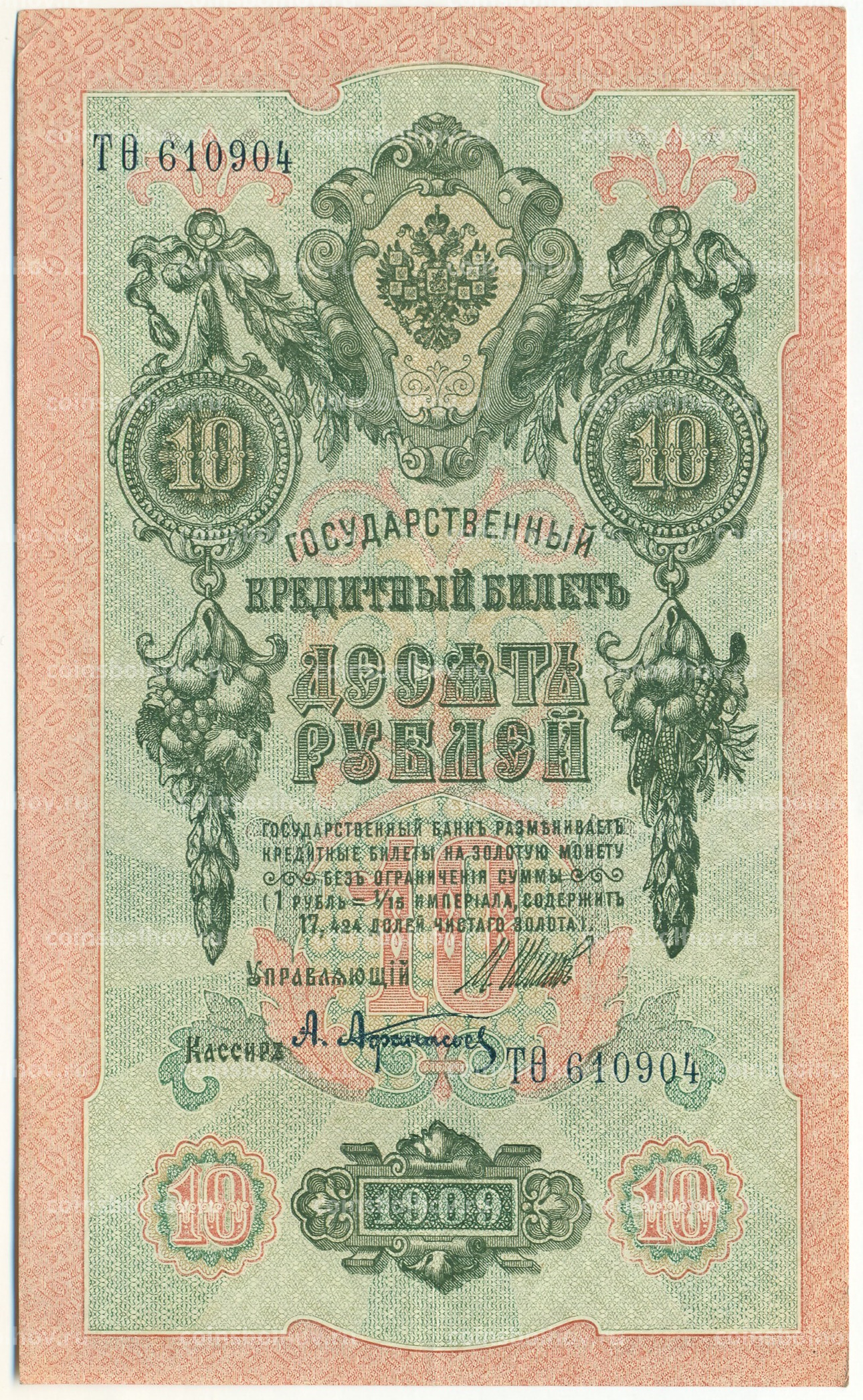 Банкнота 10 рублей 1909 года Шипов / Афанасьев