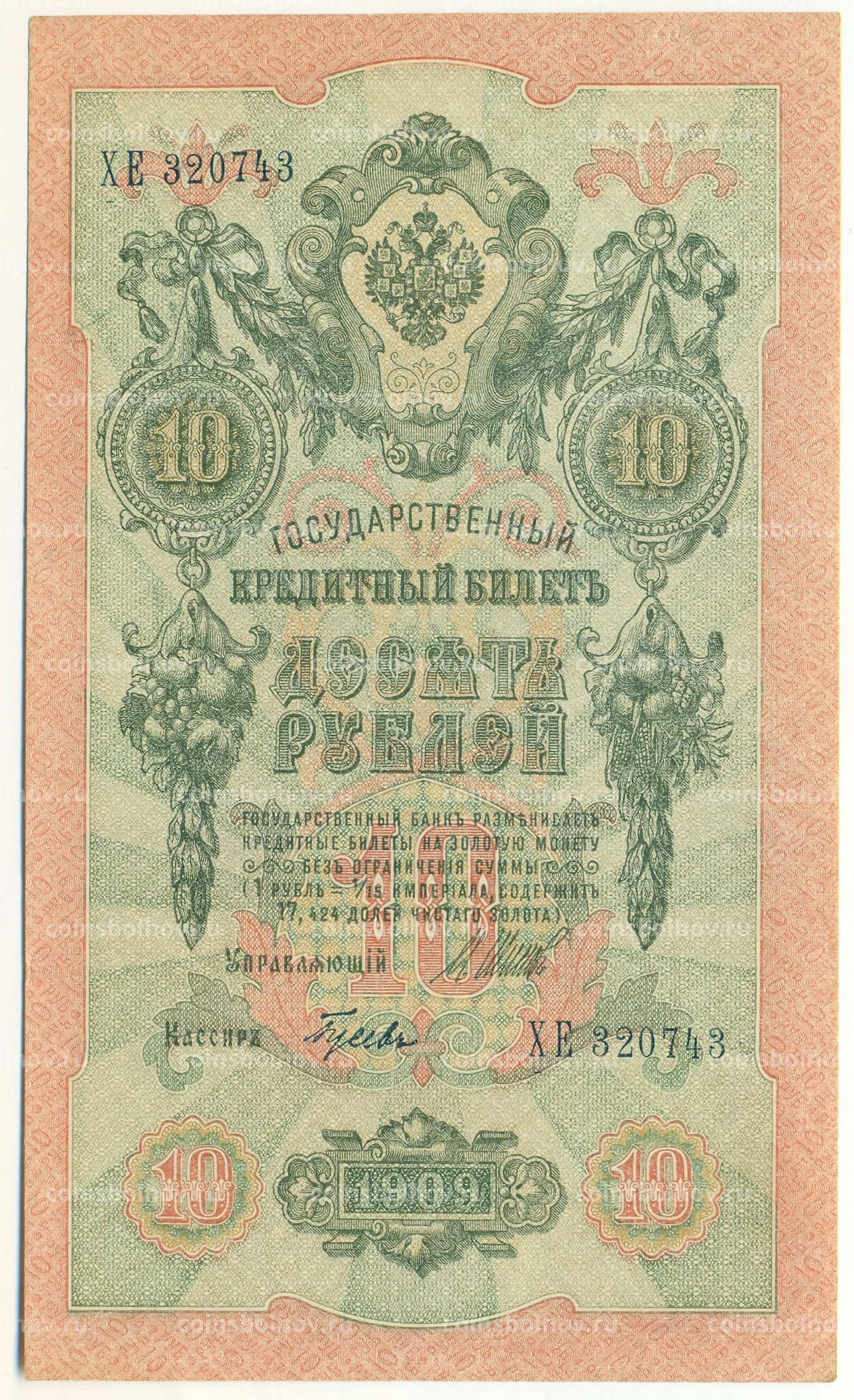 Банкнота 10 рублей 1909 года Шипов / Гусев