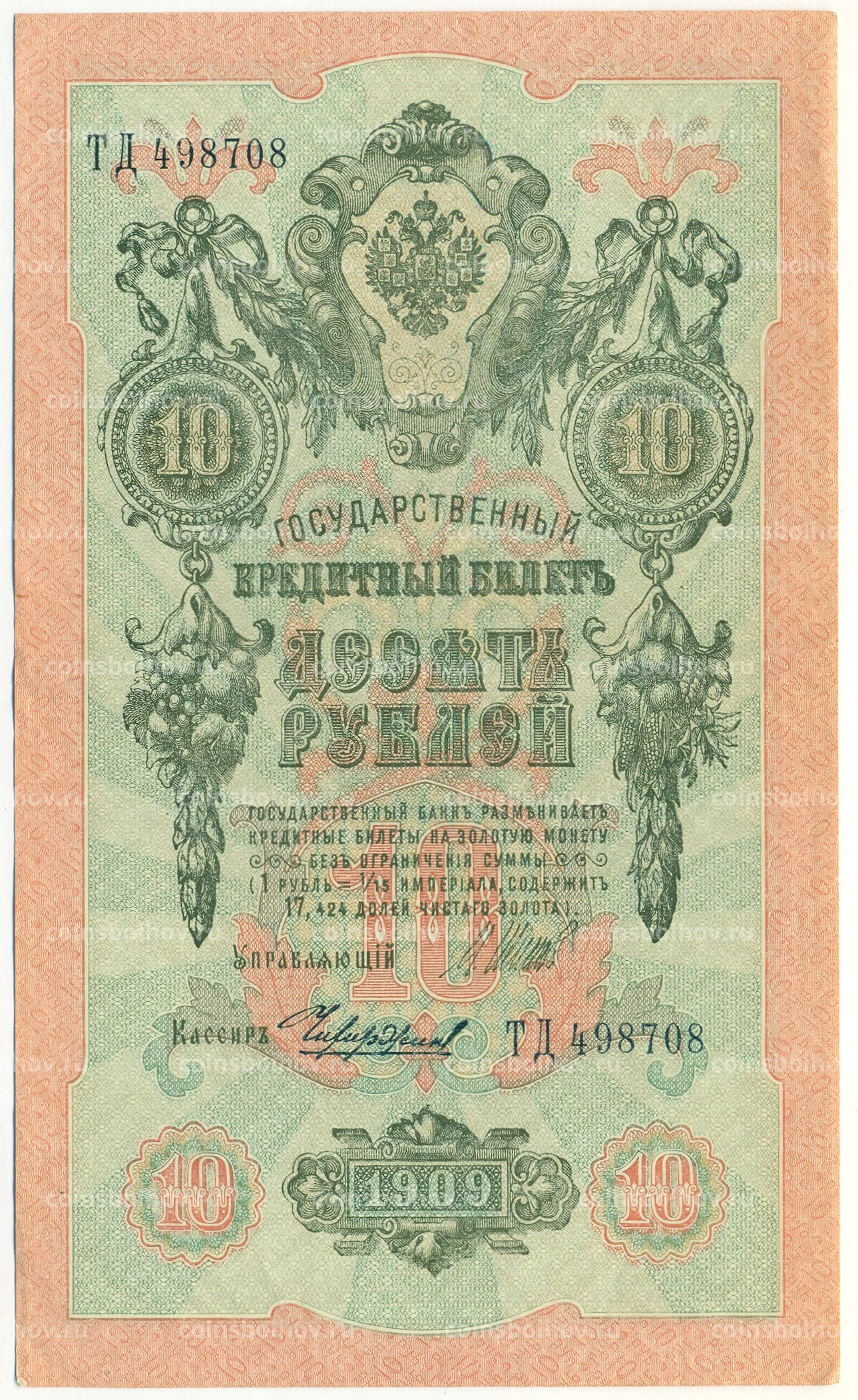 Банкнота 10 рублей 1909 года Шипов / Чихиржин