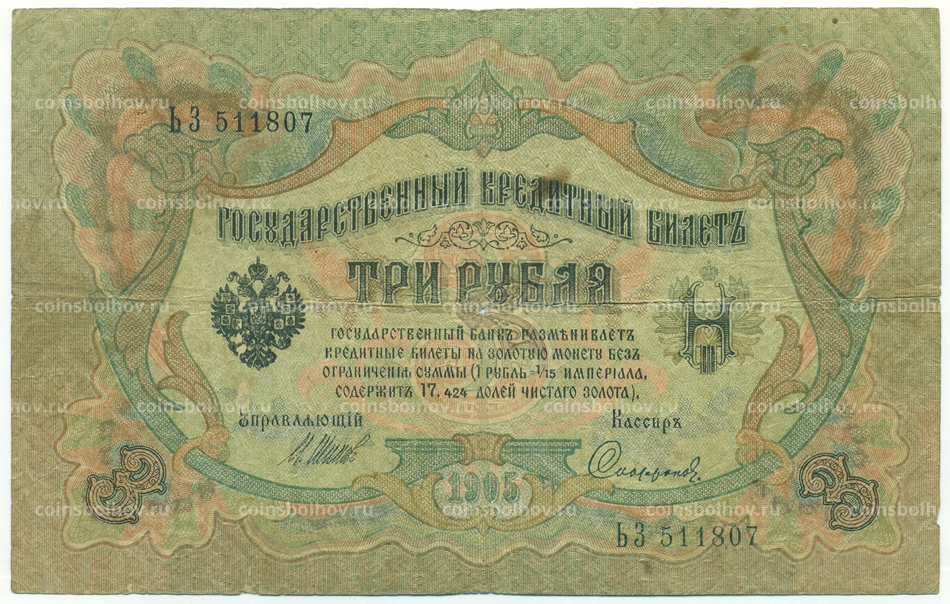 Банкнота 3 рубля 1905 года Шипов / Софронов