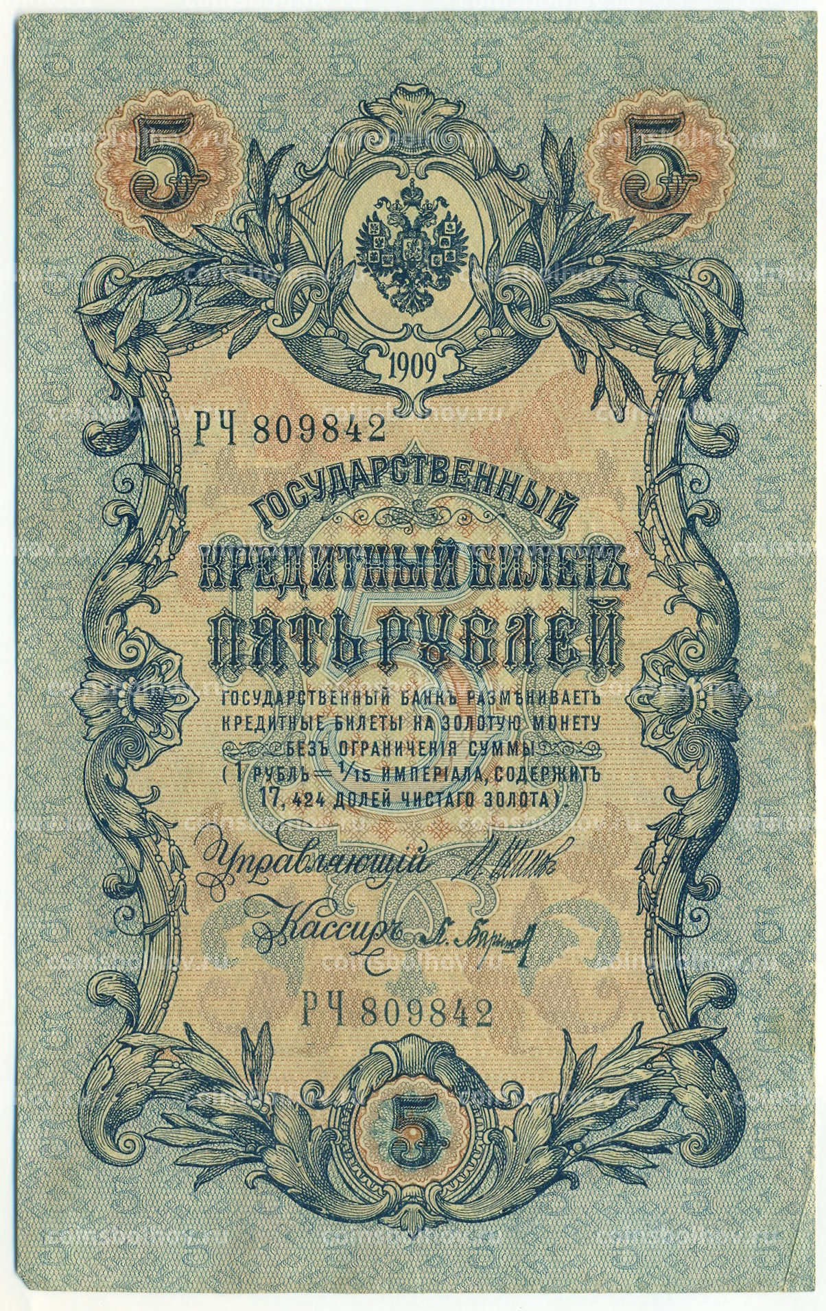 Банкнота 5 рублей 1909 года Шипов / Барышев