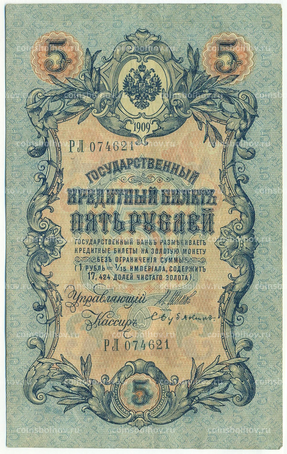 Банкнота 5 рублей 1909 года Шипов / Бубякин