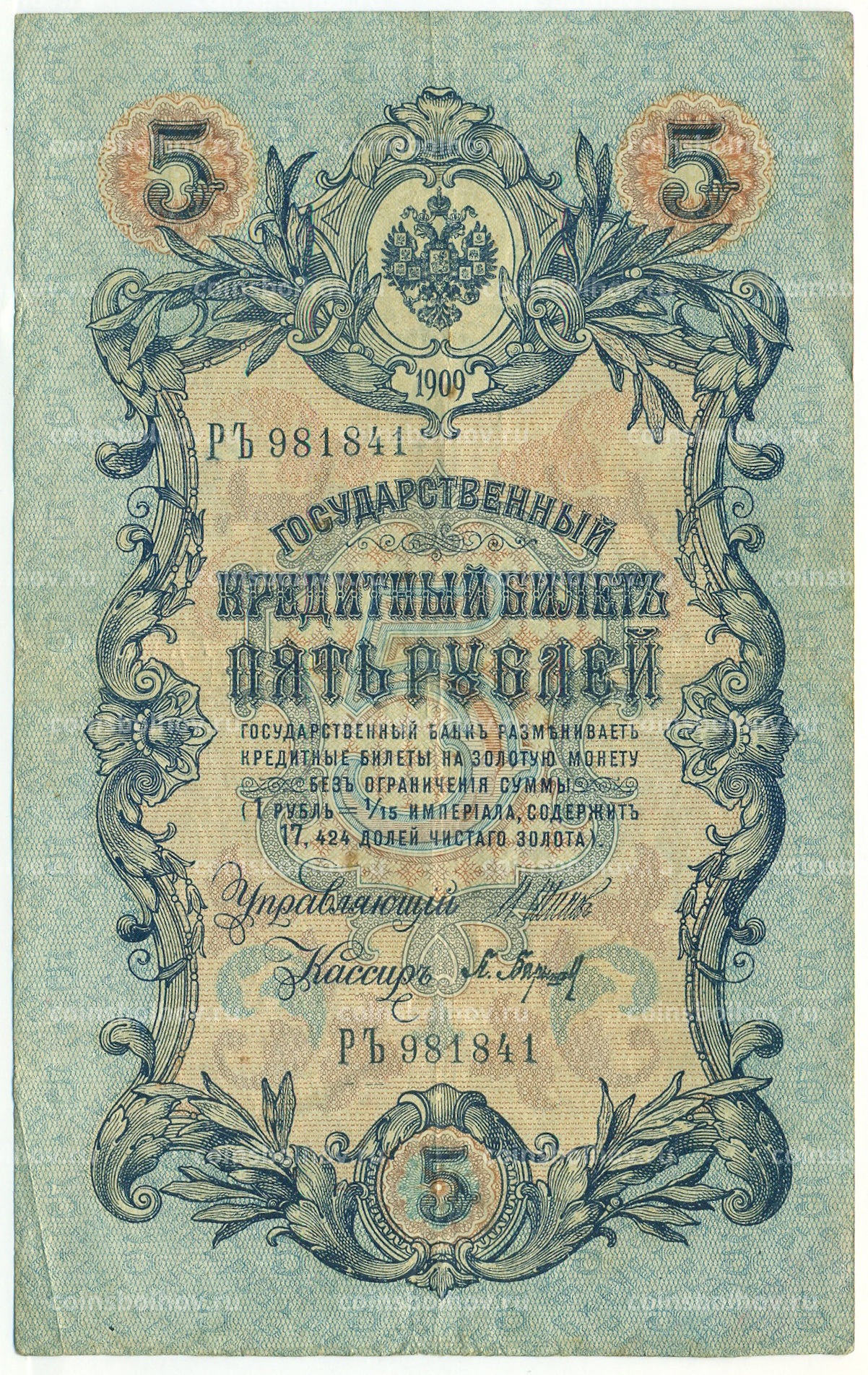 Банкнота 5 рублей 1909 года Шипов / Барышев
