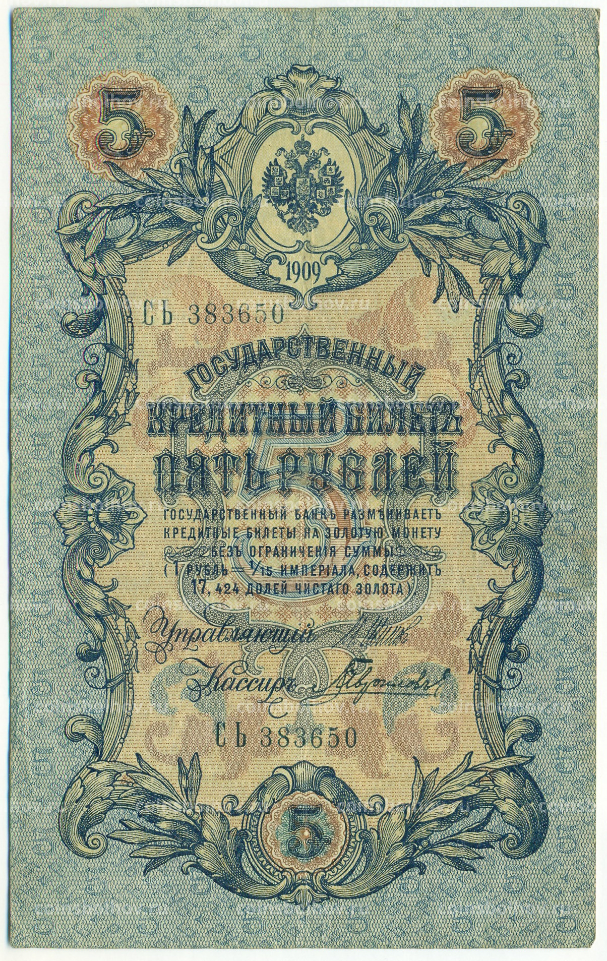Банкнота 5 рублей 1909 года Шипов / Гаврилов