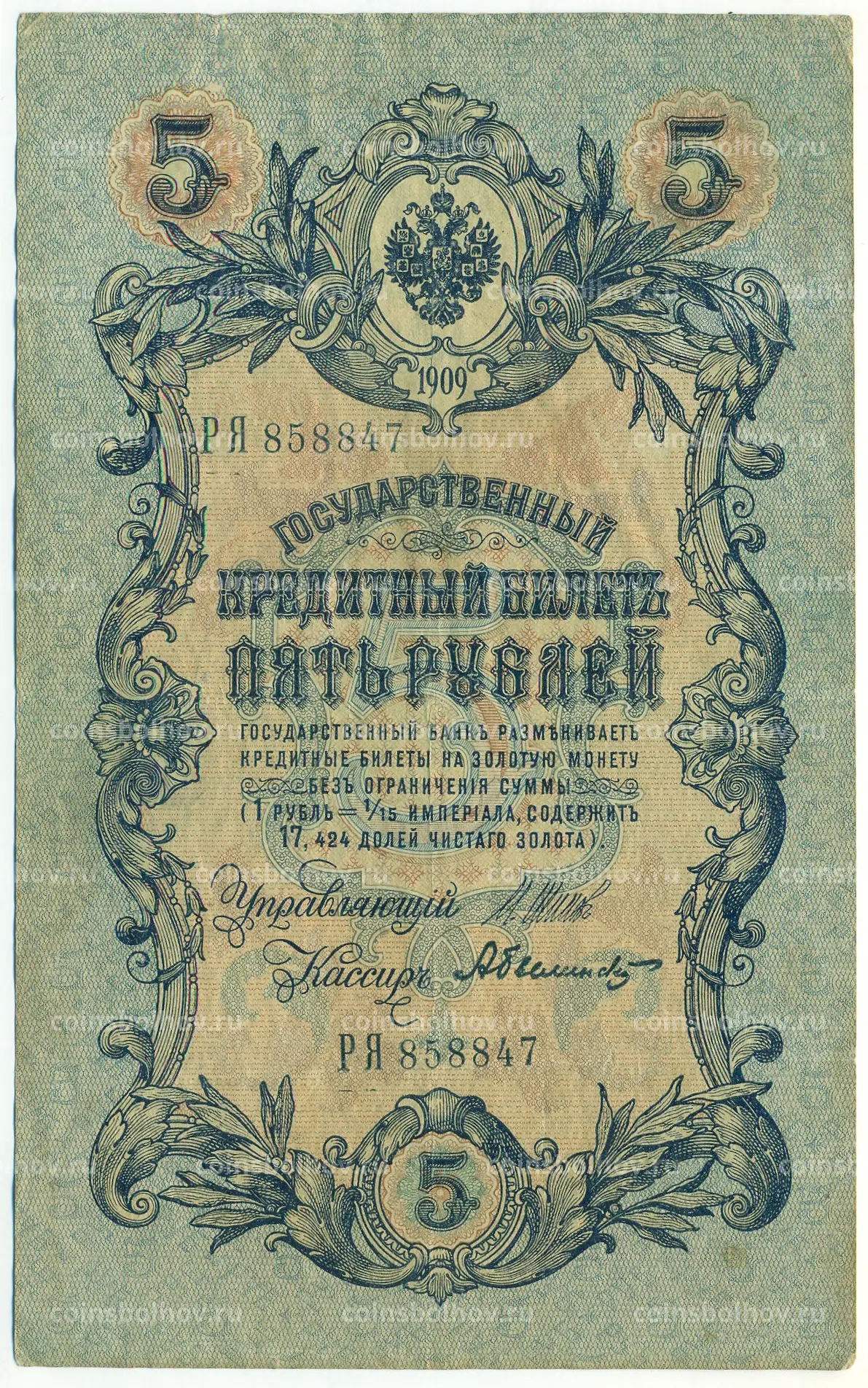 Банкнота 5 рублей 1909 года Шипов / Былинский