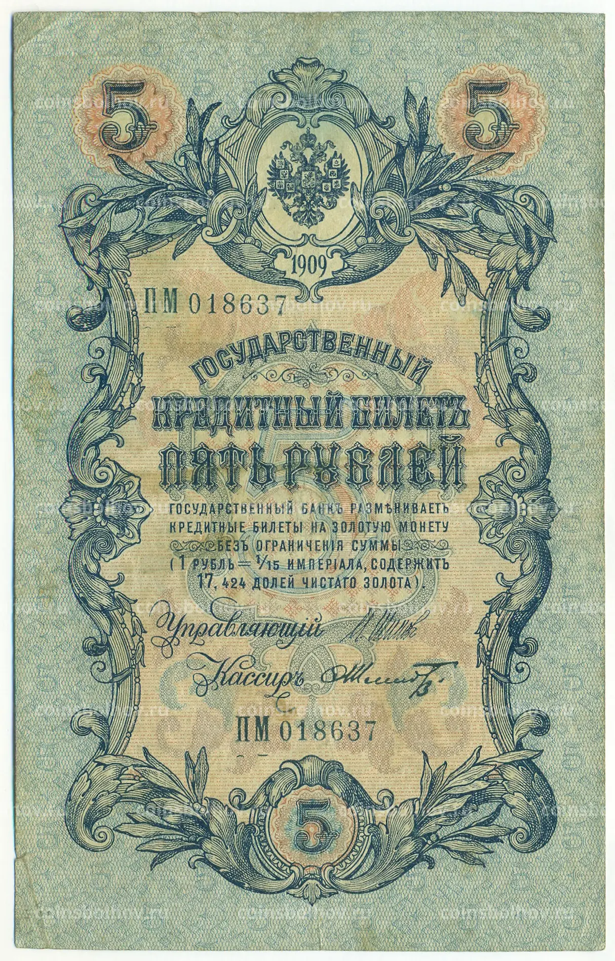 Банкнота 5 рублей 1909 года Шипов / Шмидт