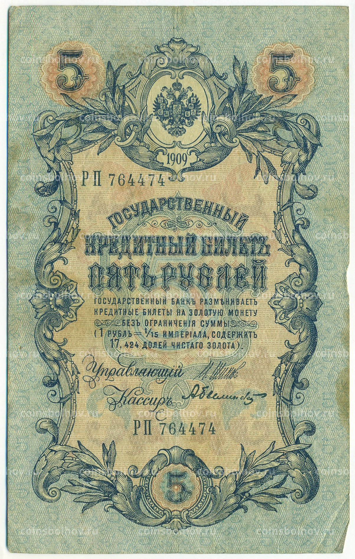 Банкнота 5 рублей 1909 года Шипов / Былинский