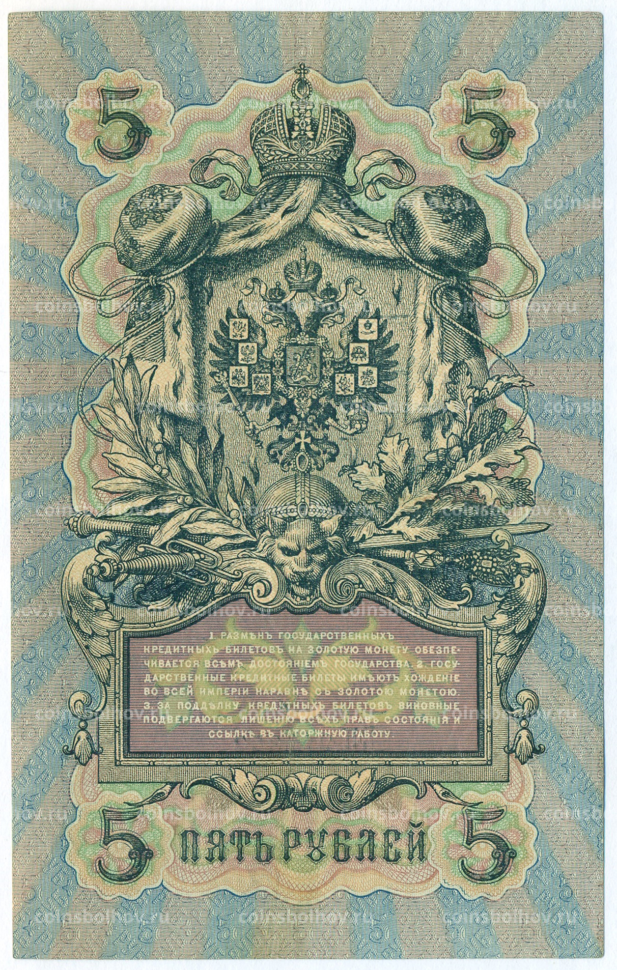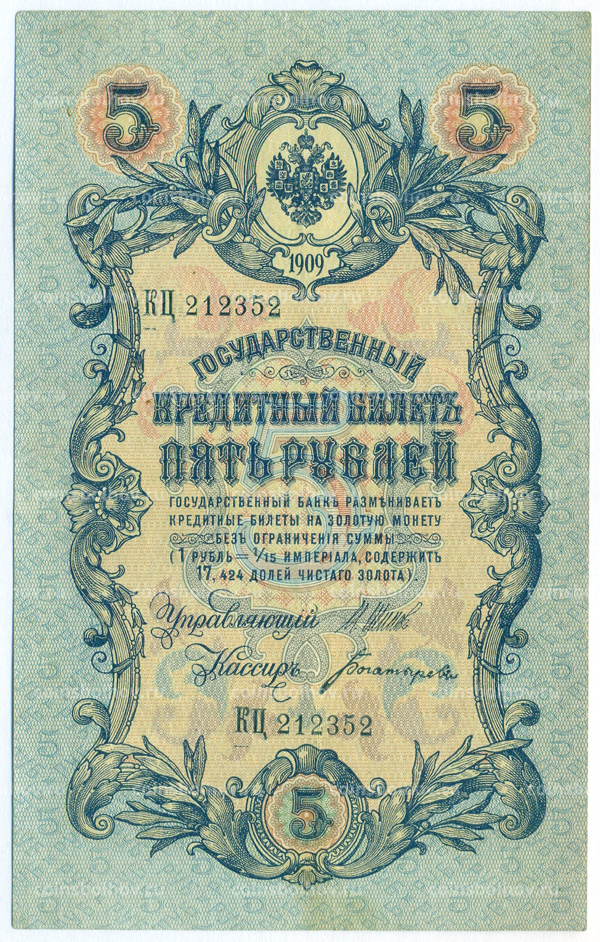 Банкнота 5 рублей 1909 года Шипов / Богатырев