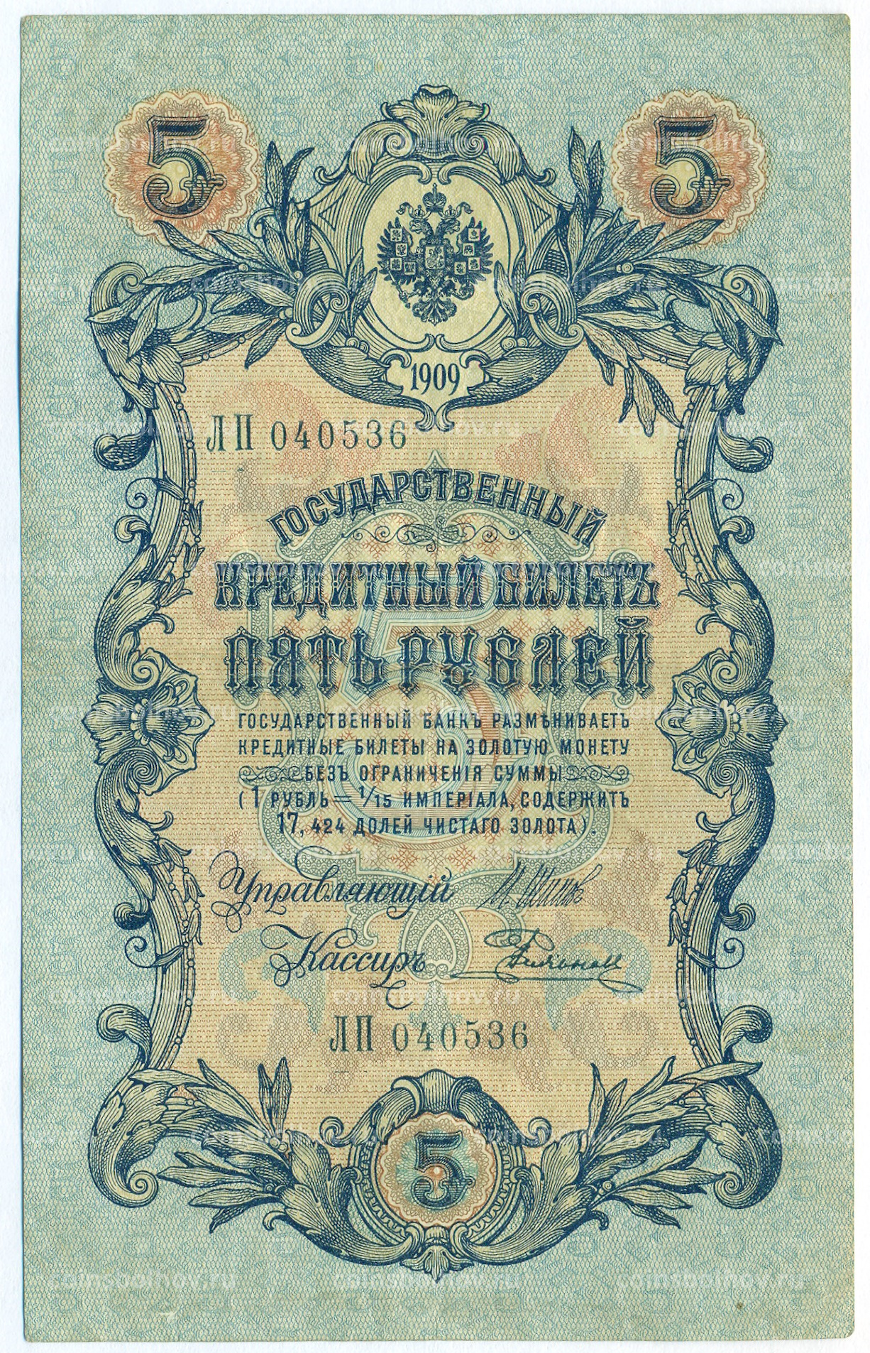 Банкнота 5 рублей 1909 года Шипов / Родионов